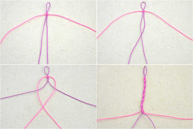 2 º, cruzar el brazo izquierdo de hilo púrpura sobre el derecho de otro;