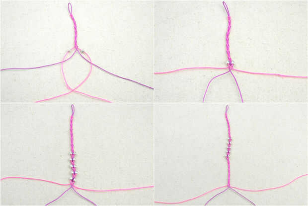 2 º, añadir granos de plateado a ambos lados del hilo rosa, en la trenza y cuando salen, continuar rebordear y trenzado;