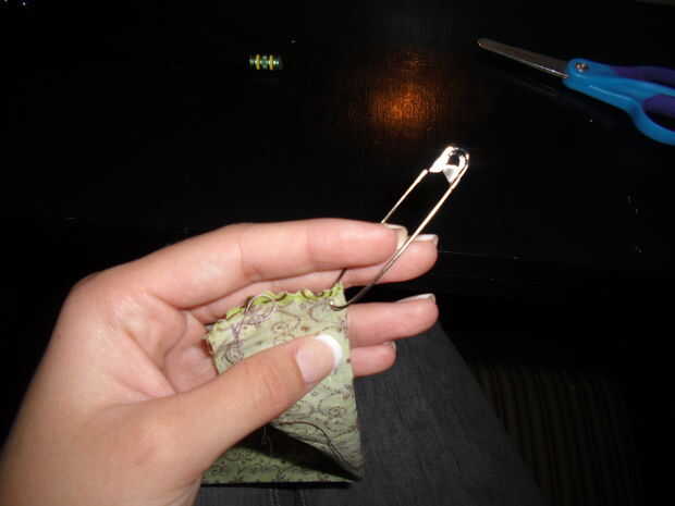 Coloque un alfiler en un extremo de la correa y luego meter por en medio para ayudar a girar la correa por el lado derecho es hacia fuera. y presione con el hierro para hacer planos. Apartar las correas