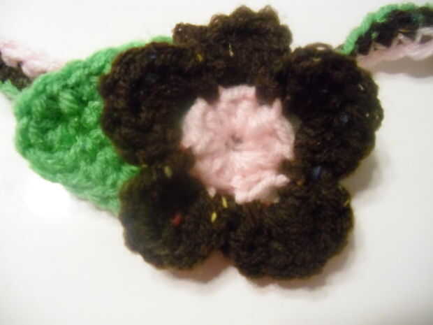 1-Acople marrón ch 3, skip un st entonces sl st en St. siguiente hacer esto alrededor de todo el camino y volver al principio (creará 5 lazos)