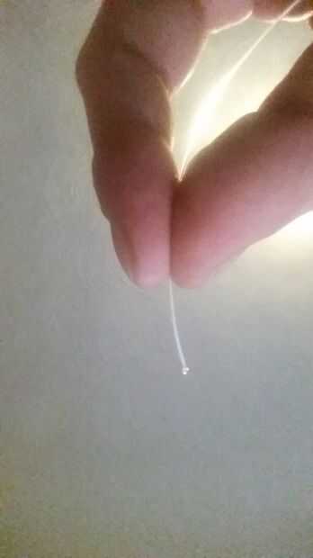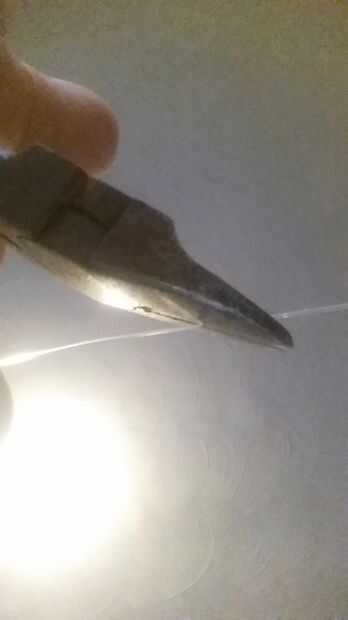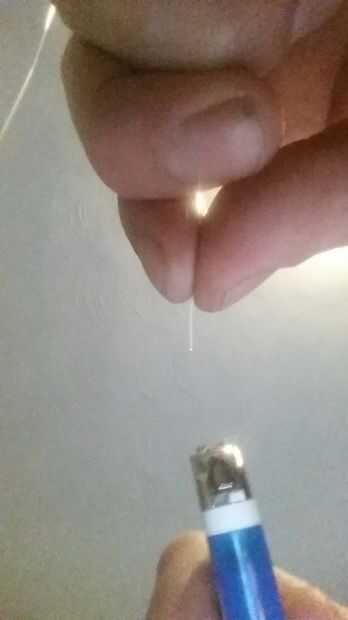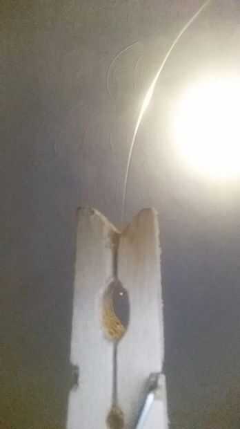 Cortar un hilo de sedal sobre la longitud de su brazo y quemar un extremo cuidadosamente para crear una cuenta. En este uso final el clip de ropa dejar las cuentas de ir a través. En el otro extremo de la línea de corte diagonal por lo que es fácil de insertar las cuentas.
