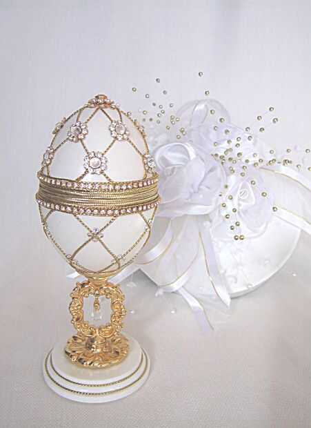 Está forrado con seda y se sienta en un soporte plateado de 24 k de oro. Se utilizaron las filigranas de oro y cristales Swarovski para decorar.