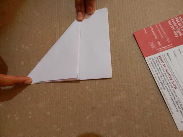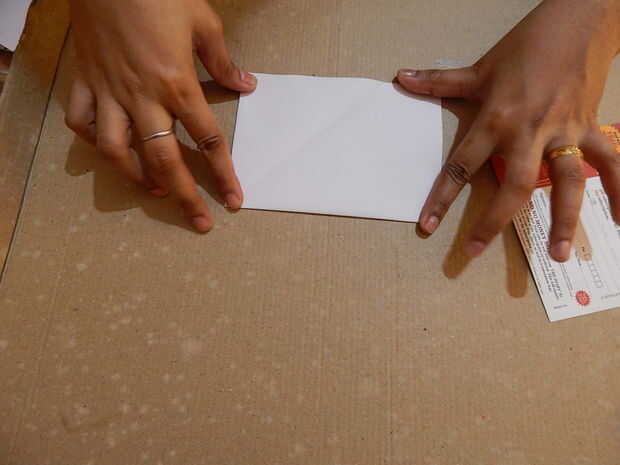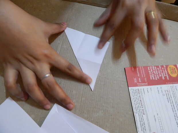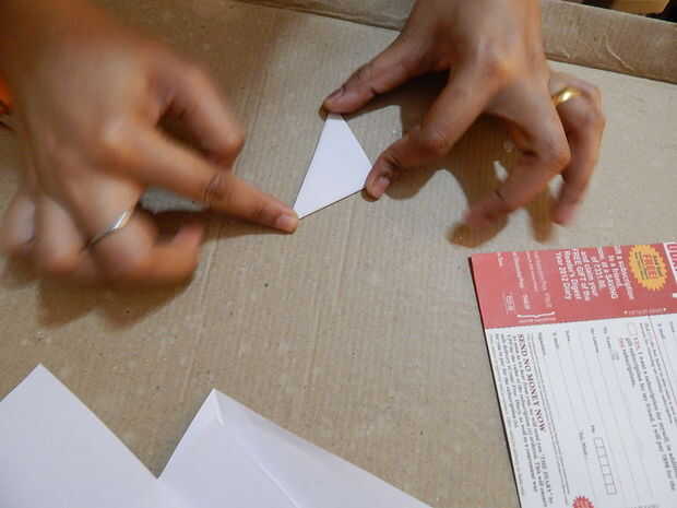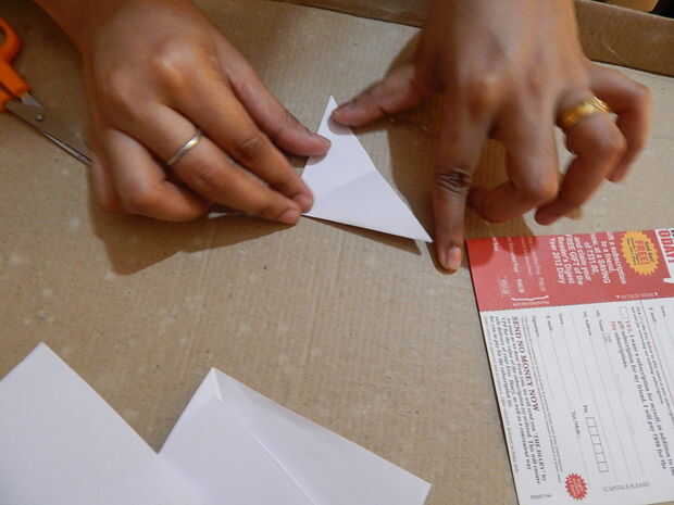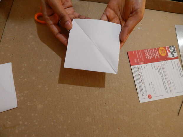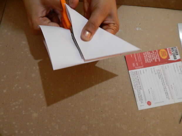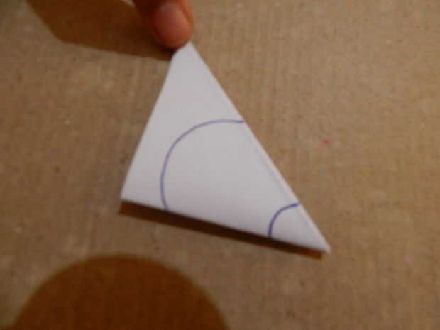 • Dobla el papel diagonalmente tres veces para que sea un triángulo. Dibuje dos arcos sobre el papel, una en la parte superior y otra en la parte inferior