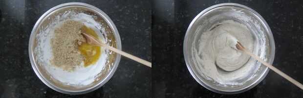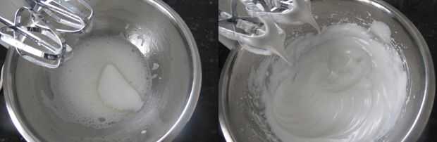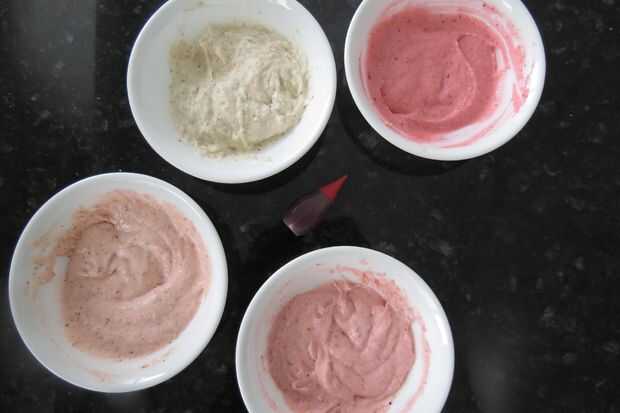Batir las claras de huevo a velocidad media hasta que quede espumosa. Añadir el azúcar poco a poco y batir a formen picos. Con una cuchara de madera, añadir y combinar la harina de almendra, mantequilla, y extracto de almendra. Separar en varios recipientes y añadir colorante de alimentos como se desee. Refrigere la masa durante al menos una hora para asegurar que mantendrá su forma.