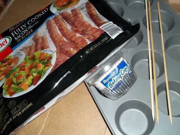pinchos (mondadientes podrían ser mejores si usted tiene una bandeja de mini-cupcake/muffin porque hará agujeros más pequeños en el tocino).