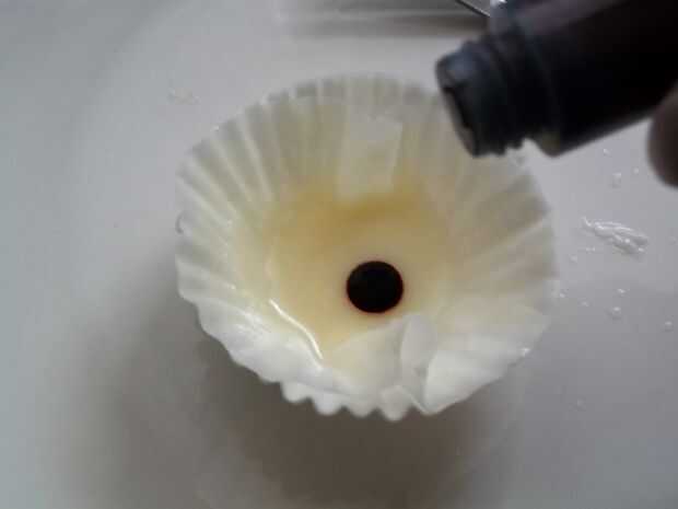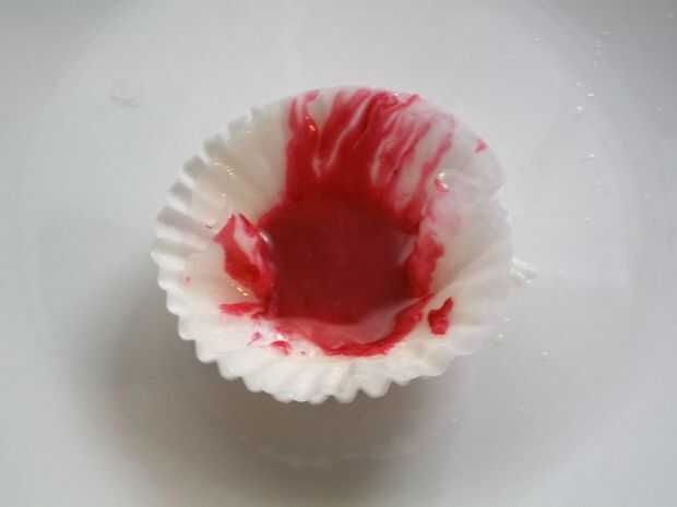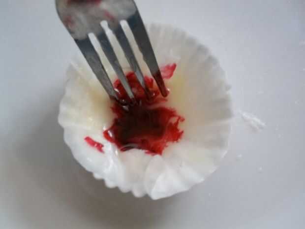 Puse unos trocitos de chocolate blanco y un chorrito pequeño de leche en un papel de Magdalena, microondas durante 60 segundos al 70% de potencia, uno alrededor de un poco, entonces puesto le en durante 60 segundos al 70% de potencia. En ese momento era liquidez suficiente agregar una gota de colorante rojo.