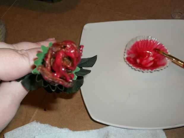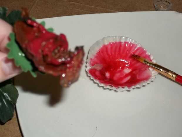 Una vez que el color se mezcla bien, lo pongo en el microondas durante 20 segundos al 70% de potencia para asegurarse de que no era solidificar aún. ¿No se puede pintar a menos que sea bastante líquido, correcto? Pinté la parte superior de las rosas con el chocolate rojo. Creo que si había utilizado colorante un poco más, habría parecía un poco mejor, por lo que piense hacer del chocolate un rojo profundo que se podría pensar inicialmente era ideal.