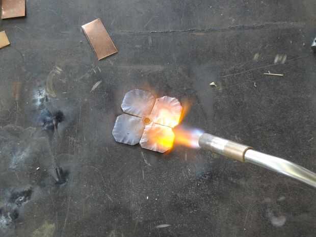 Cobre se convierte en trabajo endurecido después de martilleo, que significa que no es fácil doblar en forma. Afortunadamente, puede ser recocido tantas veces como quieres. Utilizar el soplete de gas MAPP para calentar los pétalos a un resplandor opaco (al rojo vivo no es necesario). Después de llegar a este punto, las piezas se convierten en negro con costra por lo que simplemente tirarlos en un cubo llenado de supermercado comprada vinagre blanco y lo dejaron reposar toda la noche. La acidez en el vinagre hace un gran trabajo de limpiar el cobre.