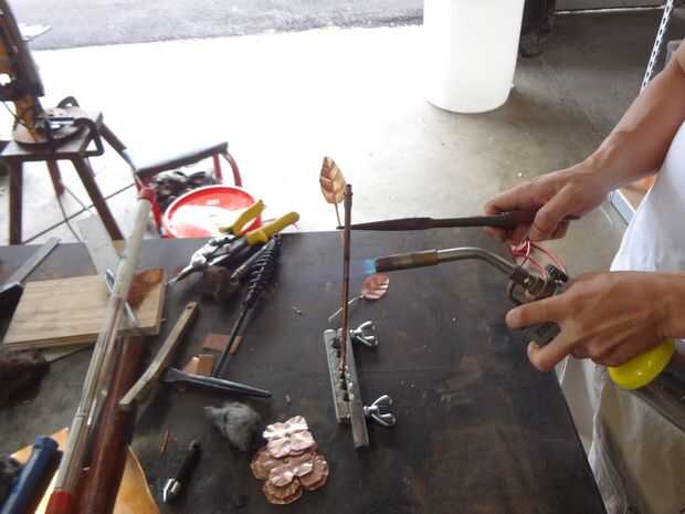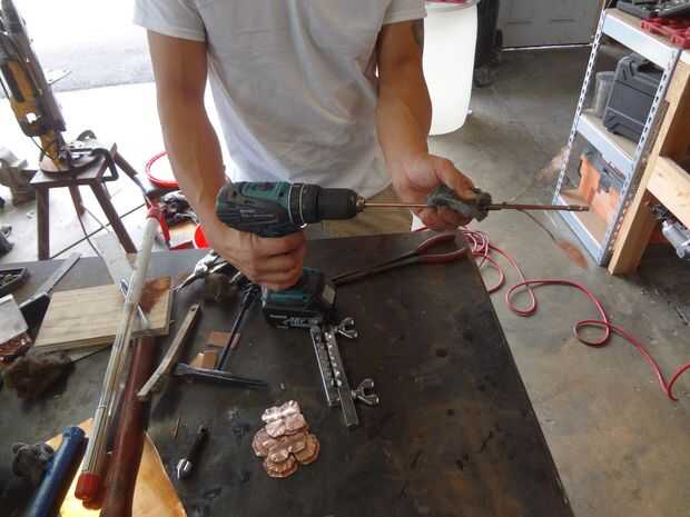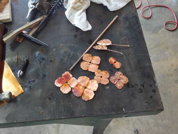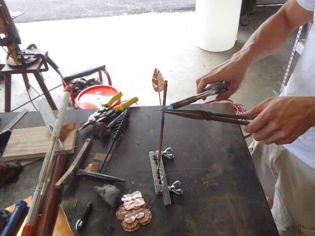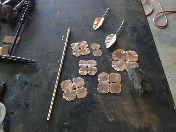 Yo estaba parado el tallo usando una abrazadera de tubo (cualquier cosa puede ser utilizado, realmente) y soldar las hojas sobre el tallo. Esto crea más fuego en un área pequeña del tallo pero no es demasiado malo. Sólo el tallo de la tirada en el taladro y girar sujetando el tallo con lana de acero para limpiar para arriba.