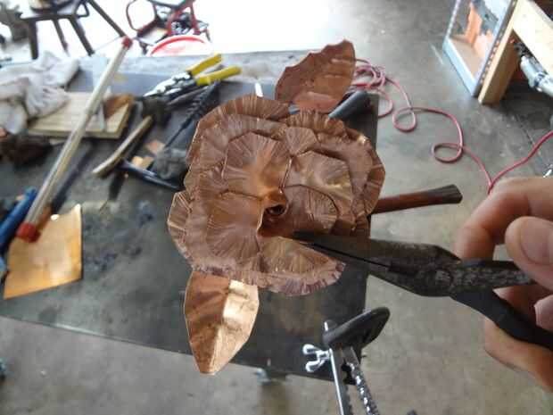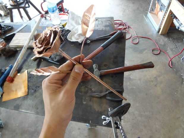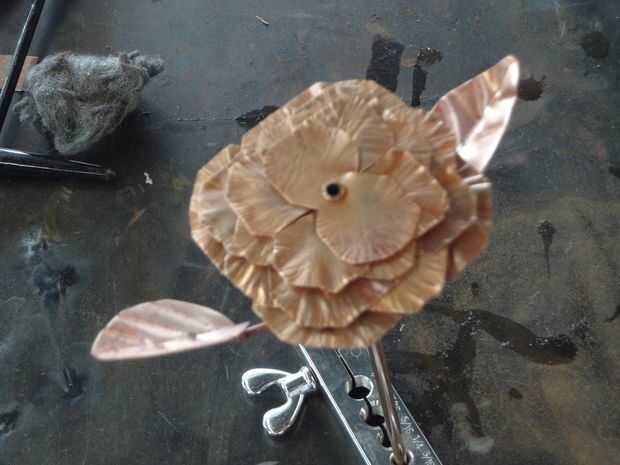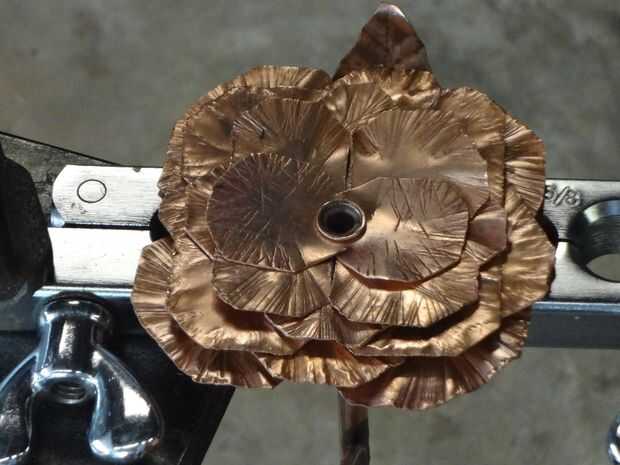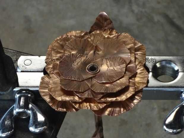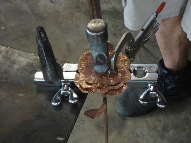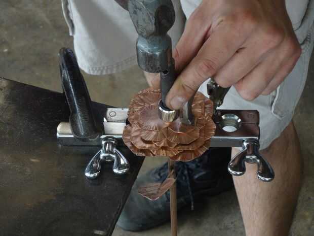 A continuación, ajustar el vástago en la abrazadera para tubería como se muestra en la foto 2 y martillado una llamarada única en el tubo con un cono en forma de herramienta de abocardar. He a continuación, utiliza un martillo de bola para martillado abajo el tubo y lo mantener los pétalos en su lugar (fotos 2-5).