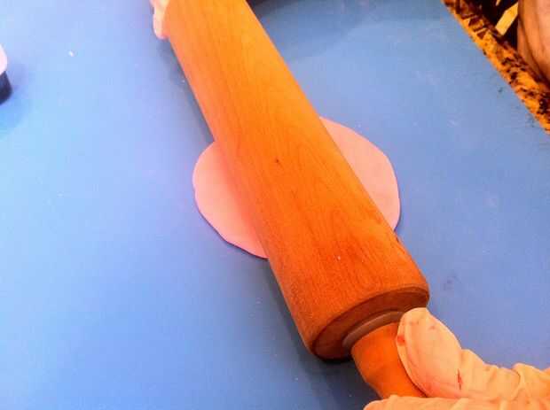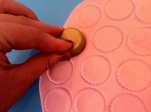 Poner la losa del fondant en la alfombra de trabajo de pastillaje (fondant) y roll muy plana. Entonces utilice el cortador de la galleta de círculo para cortar tantos círculos del fondant como puedas. Si no tienes el cortador de la galleta de un círculo, también puede utilizar una tapa de botella de agua como yo lo hice.