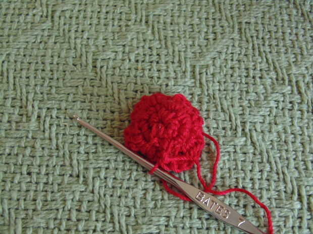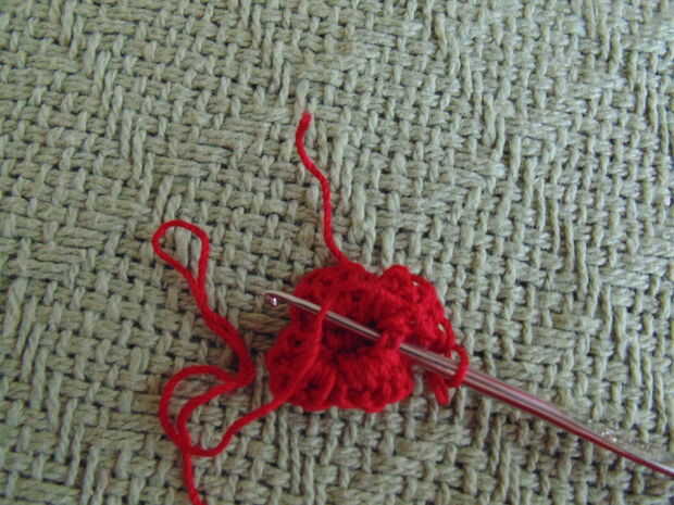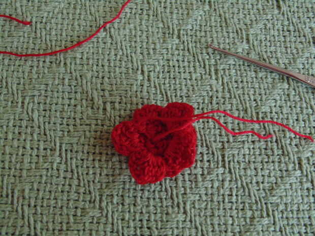 * Ch 2 y empujar su gancho bajo el ch base de la última ronda de pétalos para hacer su st.* sl repetir 3 veces para cada pétalo. CH 2 y sl st a la primera. (5 ch sp)