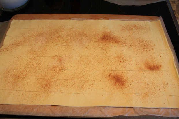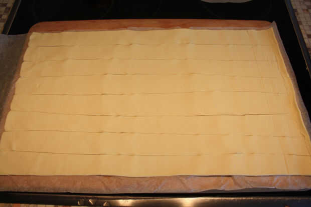Utilizo hojaldre hecho listo. Rodillo hacia fuera y corte en tiras. Debe ser aproximadamente 1,5 cm de ancho (0,6 pulgadas).