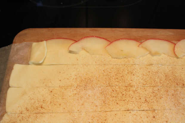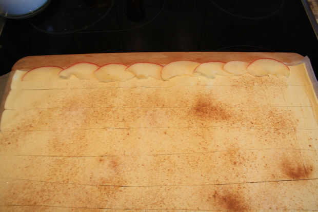 Ahora coloque las rebanadas de manzana en la masa de hojaldre. Poner las manzanas en la parte superior de la mitad de la raya. Deje que la otra mitad libre. En el extremo de la raya necesita uno 1cm (0,6 pulgadas) sin apple.