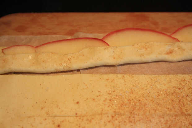 Ahora doblar la mitad libre sobre las rodajas de manzana. Asegúrese de que los extremos de las manzanas están en el redil pero la cáscara es en el exterior.