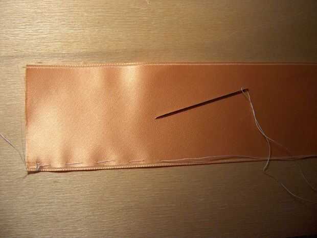 Por suerte esto no tiene que ser muy prolijo! Consigue un trozo de hilo largo como el pedazo de cinta. Solo lazo alrededor del extremo un par de veces para volver a empezar (véase la foto), luego coser muy cerca de un lado. Si está hecho, sujete el hilo en el extremo con una mano y empuje la cinta hacia atrás con la otra mano, para que los racimos. Encontré hacia fuera que tienes que manojo de todo un poco para conseguir rosas agradables, de lo contrario la tela va a envolver plana en lugar de pie aparte. Si usted piensa que ha agrupado la cantidad correcta, terminar igual que comenzó. Puesto que la parte sembrada se pega al alambre de todos modos, esta sencilla manera para fijar el comienzo y el final es suficiente.