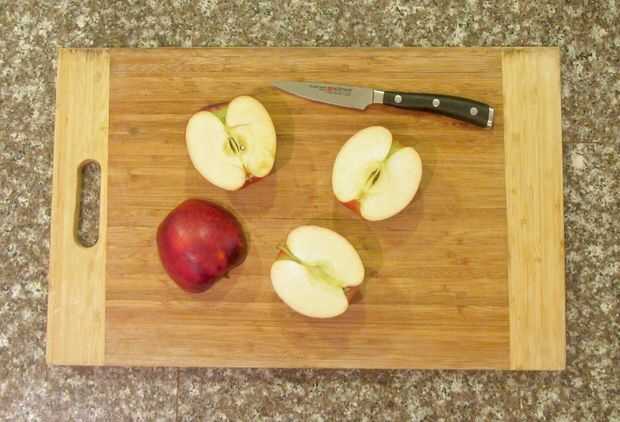 Limpia y uniformemente, cortar tus dos manzanas por la mitad. Ahora debe tener cuatro mitades de manzana. Utilizando una cucharada cucharadita a la base de su manzana.