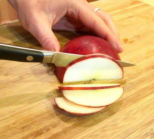 Gire cada manzana para que el corte es cara abajo en la tabla de cortar. Usando un trozo de cuchillo las mitades de manzana transversalmente hasta que son alrededor de 1 cm de espesor.