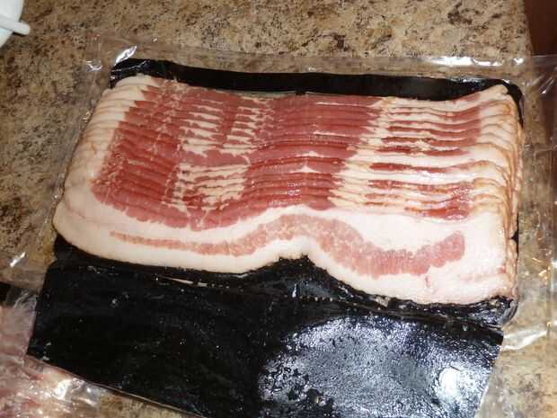 Abrir el tocino y comenzar a rodar firmemente las rosas, una pieza a la vez. Comience con el extremo más ancho del tocino, con el filo de grasa hacia abajo. Me gusta usar una combinación de tocino grueso y fino para acabar con una variedad de formas de color de rosa.