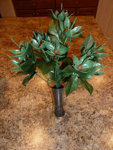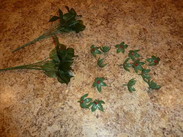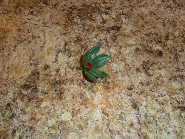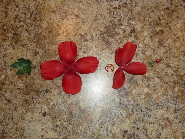 Descarte los pétalos y el pedazo de centro rojo. Vuelva a ensamblar las partes verdes restantes como se muestra.