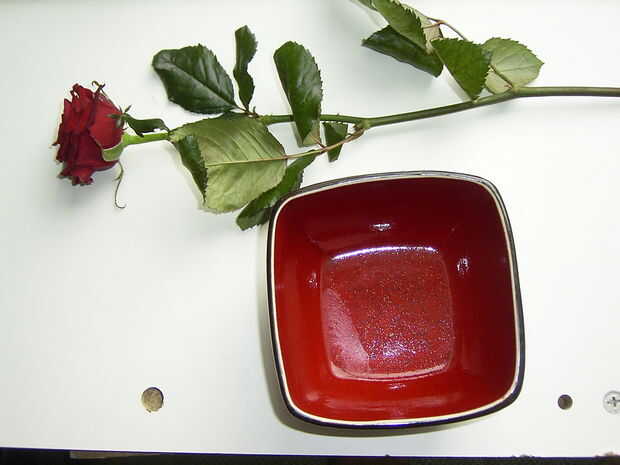- Un recipiente en el que se congele el agua que contiene la rosa. Ya que queremos que se levantó completamente contenido en el hielo, el recipiente debe ser grande bastante que nosotros podemos suspender la rosa que queda algo de espacio (por lo menos 1cm) en todos los lados. El recipiente que usé (véase las fotos) era borderline, un recipiente un poco más grande estaría mejor. (No doy medidas, puesto que el tamaño correcto de la cubeta es relativo al tamaño de la rosa).