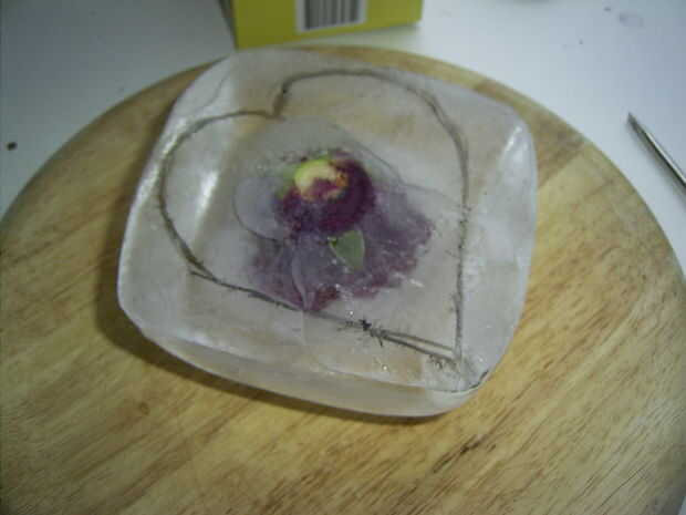 En la segunda imagen, ves el bloque resultante de hielo. El corazón pintado en el hielo era sólo un intento fallido de minas para marcar dónde tallar más adelante. La tinta a difuminar mucho demasiado rápido.