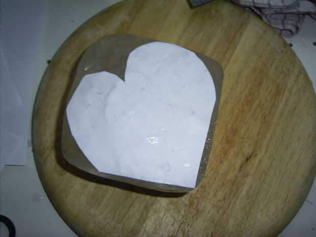 El primer problema que enfrentó fue cómo esbozar el contorno del corazón en el hielo. No pude dibujar sobre el hielo, ya que la tinta manchada inmediatamente. La solución fue cortar el contorno del corazón de papel y colocar sobre la parte plana del hielo. (Véase el cuadro). Desde ya es que se moje el hielo, el papel se pega al hielo. Sin embargo, mientras que el documento de trabajo a menudo desalojar, así que tienes que cuidar a reposicionar regularmente. A pesar de estas molestias menores, tener un esquema del corazón grandemente ayudado mientras talla. (Si el documento comienza a disolverse, sólo tómalo como una plantilla para cortar otro idéntico corazón de papel.)
