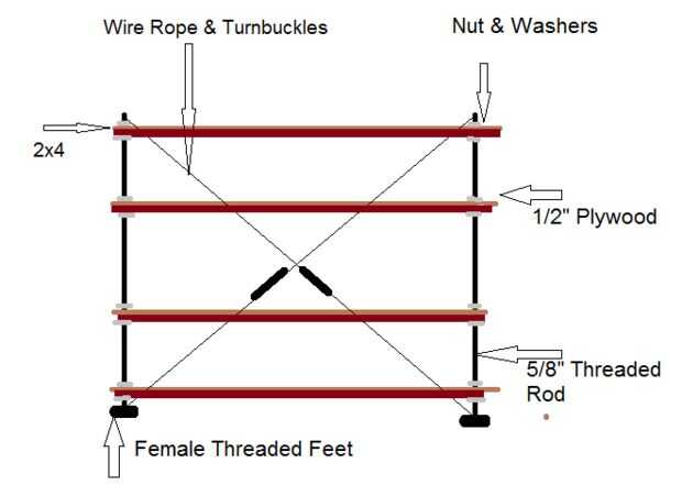 Quería grandes estantes para organizar una pequeña área de garaje y tienda de un coche. Porque alquilar el espacio no quería construir algo grande y abultada para moverse, así que opté por un diseño de plataforma que puede desmontarse totalmente y no se utiliza sujetadores permanentes (tornillos para madera / pegadas juntas / montaje de la pared). La idea era utilizar varilla roscada como base para construir estantes ajustables alrededor.