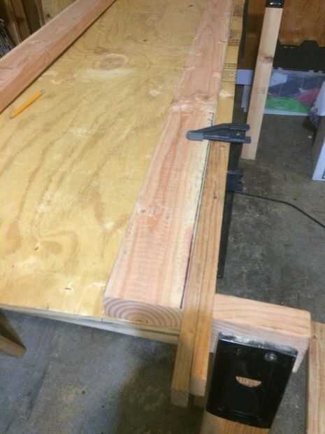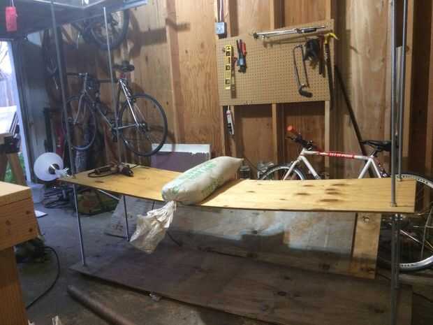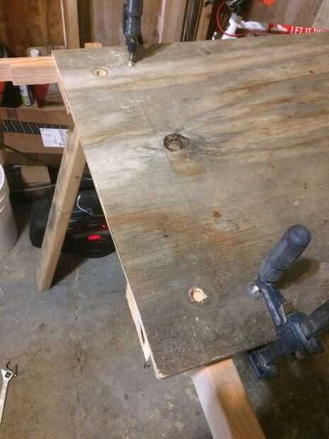 He utilizado dos láminas de madera contrachapada de 1/2". Cortar cada pieza por la mitad para dejar cuatro de 24 "x 48" piezas. I fijar las cuatro piezas juntas y perforó un agujero en cada esquina con una pala de 5/8 bit para formar un ajuste muy apretado alrededor de las varillas de 5/8" los estantes sentarse en. cada hoyo fue 3" en 3" encima de las esquinas. Después de taladrar la madera, 2 x 4 se sujetaron a la madera contrachapada y se perforaron agujeros de 5/8" usando la madera como una plantilla para los agujeros. Para centrar los agujeros en la 2 x 4 usé dos trozos de madera de scap que eran que un combinado 1 1/4" pulgadas para centrar el orificio compensado 3". El 2x4s están allí para añadir rigidez extra. He probado utilizando sólo madera contrachapada y el resultado fue bastante malo cuando le pongo una bolsa de arena ~ 50 lbs) en él.