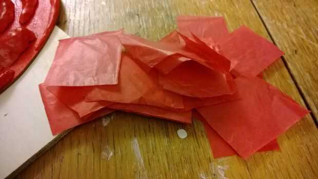 Rasgar para arriba su papel tejido rojo en pedazos pequeños. Usando el palillo de papel de seda y cubierta de todo corazón entonces con la capa final de PVA, dándole un brillo brillante.