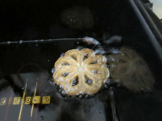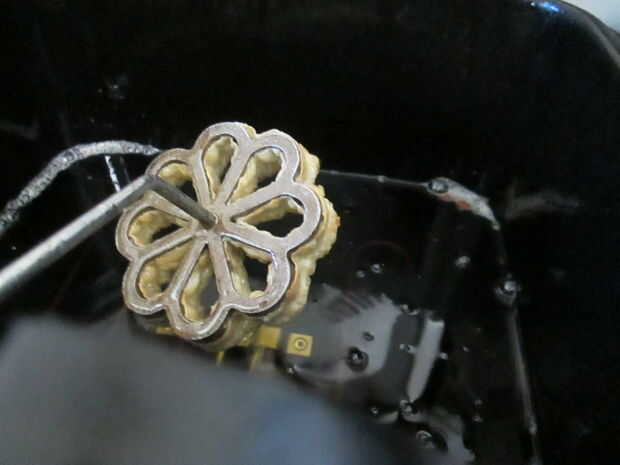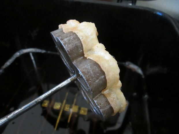 Retire del aceite y usar el cuchillo para empujar hacia abajo en los lados de la roseta hasta que sale la plancha y cae dentro de los aceites.  (Tenga en cuenta que usted tendrá que usar el cuchillo para raspar realmente el primer par de galletas.  Creo que esto tiene que ver con conseguir la cantidad correcta de aceite en el metal de hierro roseta.)