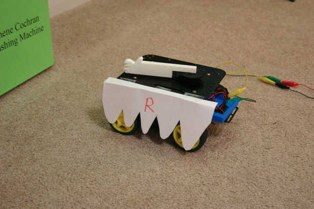 Tuve que crear e imprimir placas, platillos (placas en el 60% de su tamaño) y gafas. También tuve que hacer un brazo de Rosie. Falda de Rosie fue cortada del papel. La acción del robot fue controlada manualmente usando jumpers de clip y batería.