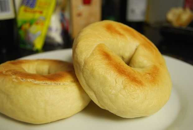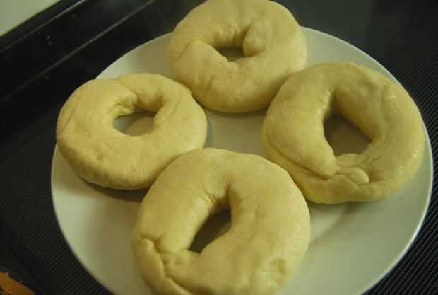 Sacan deje seco durante un minuto. Luego hornear precalentar el horno a 200 C durante unos 10 minutos, luego voltear el bagel y mantener hornear durante otros 10 minutos.