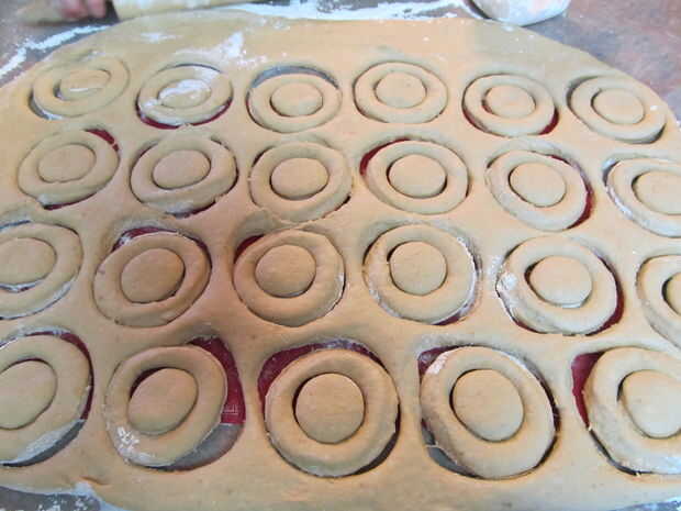 3. Corte las donas con el cortador de donas. (No tengo uno así que usé una taza, luego una botella de condimento las más pequeñas de los centros)