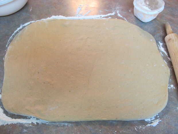 2. Extienda la masa sobre una superficie ligeramente enharinada. (aproximadamente 1/2" de grosor)