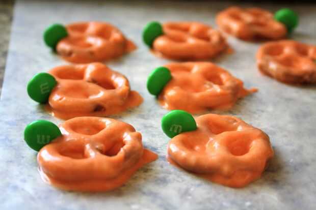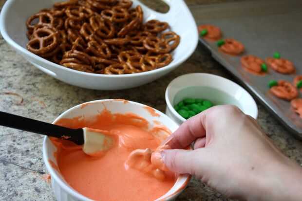 Una vez hayas sumergido el pretzel, agregando una buena capa, colóquela sobre un trozo de papel de cera. Mientras que todavía ha mojado, tome una verde M & M y situado en la tutela de lo pretzel, en su lado. ¿Ver? Ahora es un lindo pequeño tallo verde.