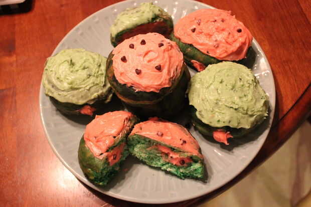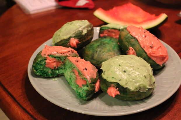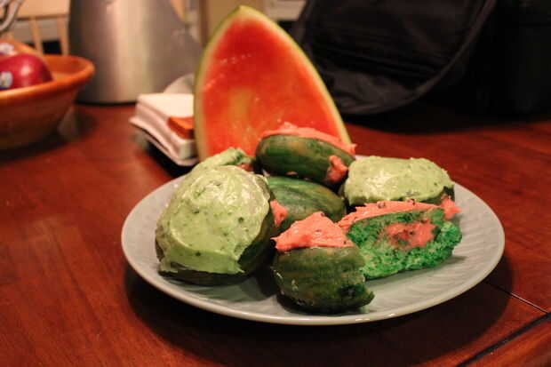 Las heladas sus donuts en cualquier color que te gusta. Todos se atan maravillosamente con el aspecto de sandía. Incluso agregué más helar dentro los donuts para dar más dulzura al racimo.