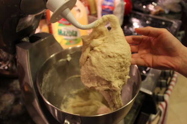 la masa debe ser maleable todavía casi firme. Debería ser fácil de sacarlo de la amasadora y la bola para arriba.