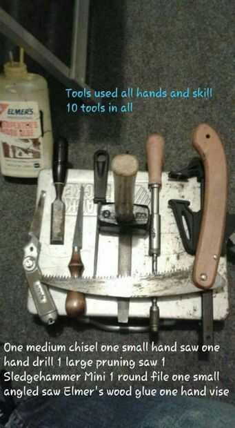 Herramientas que quería quedarse con el mismo periodo de tiempo herramientas cuando esta tabla fue hecha por lo que opté por cincel redondo mini mazo archivo supuesto archivo uno grande vio para las piezas grandes que todo utilizan como una poda vio entonces tuve dos sierras de mano pequeño para 1vice de trabajo de precisión por lo que podía pegar las piezas juntas para agregar el pegamento de madera de fuerza Elmer varios taladro pedacitos pesados 1 par de pinzas no olvide proteger su ojos
