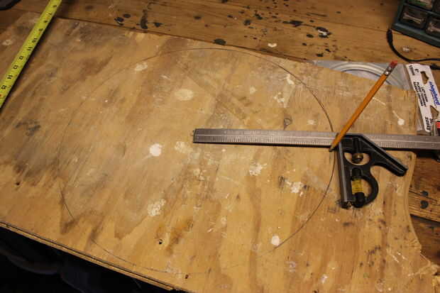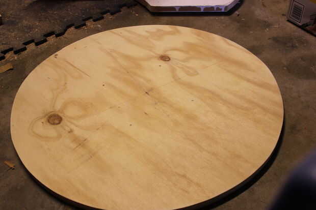 Una vez más fui con redondo (siendo esta un elemento rotatorio temático parecía apropiado) para mi base. Es aproximadamente de 24" y la plataforma de mi objeto es aproximadamente 20" - parecía un buen punto de partida para mí. Mismo procedimiento de diseño como el objeto plataforma - centro de uñas, combinación de cuadrados y cortar con una sierra de calar, arena los bordes. Usted sabe el taladro por ahora.