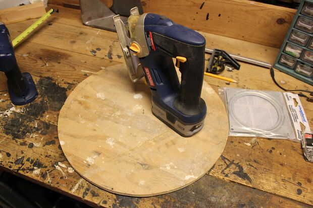 Corte su plataforma de objeto - se trata de la pieza que su objeto de análisis se sentará en el. Hice la mina cerca de 20" y redondo de 3/4" madera contrachapada. Trazado mi círculo clavando un clavo de acabado pequeños en el centro, utilizando mi combinación cuadrado de 10" y dibujó hacia fuera un círculo. Nada de lujo. Utiliza una sierra de calar para cortar hacia fuera y luego lijar los bordes un poco justo para limpiar para arriba. Otra vez, si quieres simplificar las cosas puede hacer esta plaza por lo que más fácilmente puede hacer el corte con Sierra de otro. Si no tienes madera contrachapada y quiere pegar hasta un bosque en blanco de uso que va a trabajar, también.
