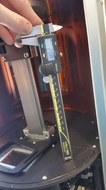 El sensor de bloqueo es en el lado derecho de la máquina. Parece una varilla roscada de plástico con dos tuercas grandes, trabándolo en el lugar. Es sólo un interruptor reed que comprueba un imán en la parte inferior de la bandeja de resina soporte de la bandeja. Debe colocarse 2mm por encima de la placa media como se muestra en la imagen. Si usted tiene problemas donde Ember mermeladas falso después de ajustar el sensor que debe ser reemplazado. Si obvio dulces pasan desapercibidos puedes bajar, pero no hay una manera muy clara para saber cómo bajo además de ensayo y error durante una impresión. La marca de 2mm debe detectar atascos dentro de las tolerancias de Ember para casi todos los sensores.