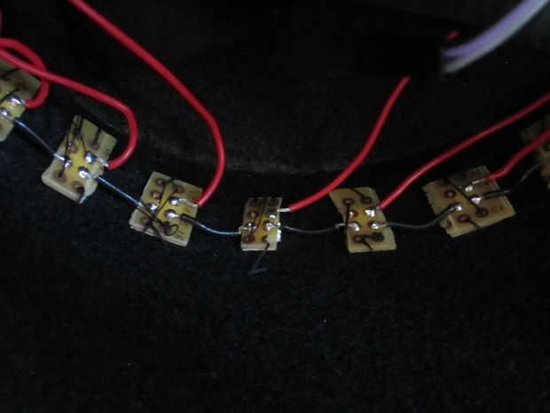 Estaño dos cables a cada uno de los cables negativos de los LEDs a través de la perfboard para que haya una línea de LEDs conectados por cables. Estos cables van a ser entre los agujeros en su sombrero así que hacen tan larga como la longitud entre los agujeros. También, soldar un cable a cada uno de lo positivo que es cerca de 9cm de largo, dependiendo del tamaño el sombrero. El positivo al circuito en el centro del sombrero y los cables negativos Irán a tierra. Lo siento la foto es tan mala, cosí los leds el sombrero antes de tomar una foto.