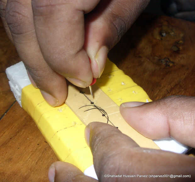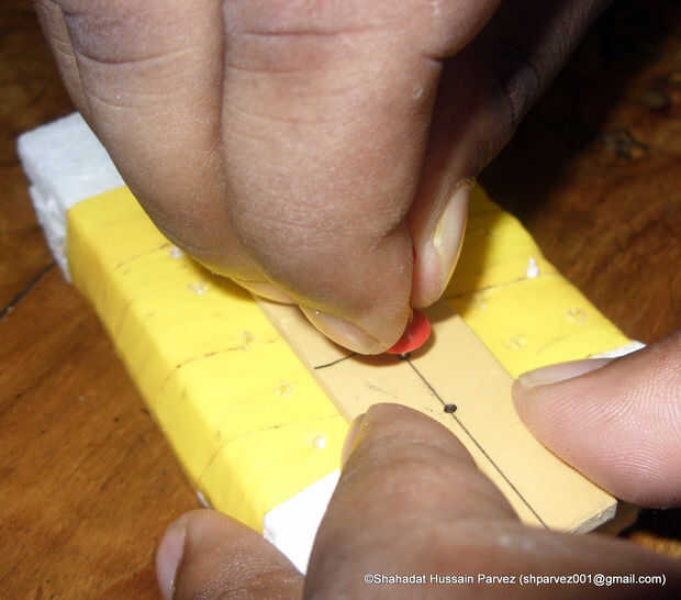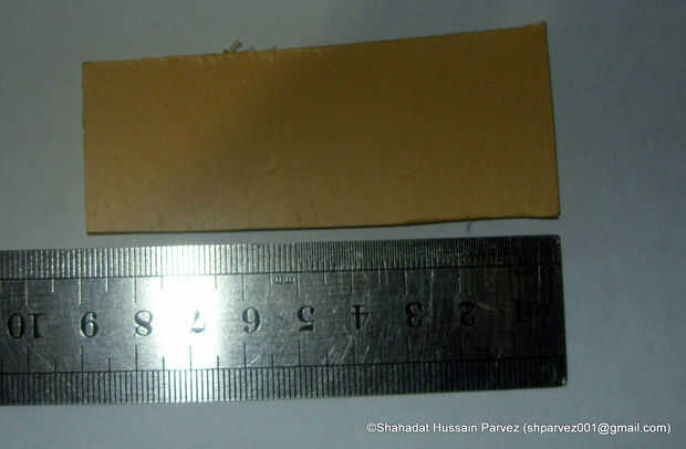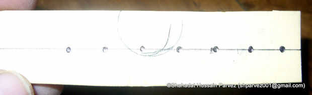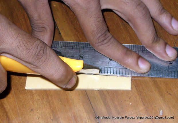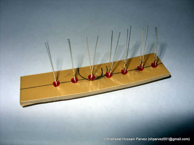 Primero tome una tira de 9cm del tablero del pvc y cortar según el ancho deseado. Marca 7 puntos de distancia en alrededor de la mitad de la tira de 1 cm. Ahora perfora agujeros en las pintas y agrande los orificios para que los LEDs se ajusta perfectamente. Ahora poner los LEDs en los agujeros. Asegúrese de que todos los LEDs se ajustan en el mismo lado (es decir ánodos en el mismo lado).