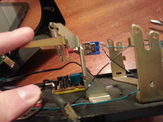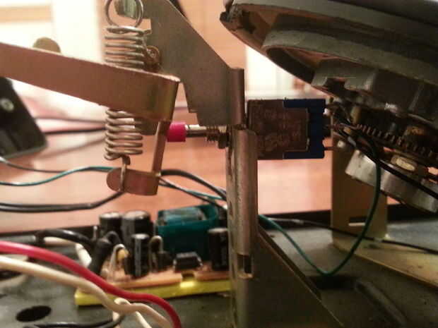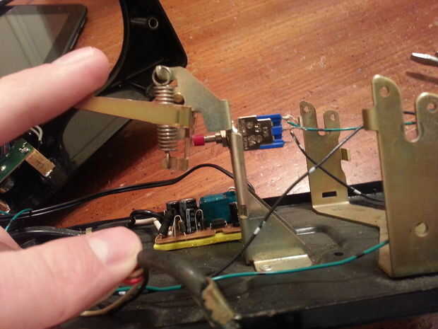 El interruptor que usé fue un pulsador momentáneo del SPDT cambia de Radio Shack SKU: 275-1549. El botón rojo de plástico en el extremo tiene que modificarse para que el gancho puedo presionar y liberar correctamente.