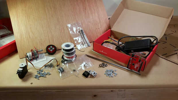 Además de estas piezas utilizamos madera contrachapada de 3/16" para todas las piezas estructurales, cortadas con el cortador del laser como un v3 de pcDuino para la interfaz principal de la web y control de la máquina.