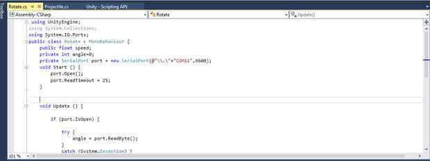 <p>using UnityEngine;<br>using System.Collections; using System.IO.Ports; public class Rotate : MonoBehaviour { public float speed; private int angle=0; private SerialPort port = new SerialPort( void Start () { port.Open(); port.ReadTimeout = 25; } void Update () { if (port.IsOpen) { try { angle = port.ReadByte(); } catch (System.Exception) { } } transform.rotation = Quaternion.Slerp(transform.rotation, Quaternion.Euler(0f, angle, 0f),speed*Time.deltaTime); } }