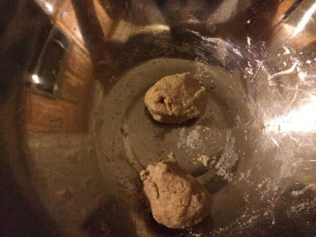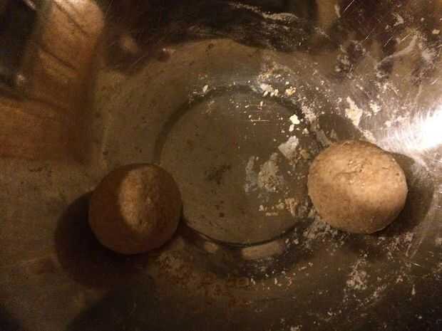 Después de que mezcla el agua y la harina se obtiene la masa que es la primera imagen. Gancho agarrador y cantidad buen puñado de pasta en la mano y rodar.