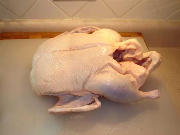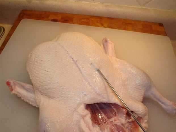 Usando un pinchazo agudo pincho la piel del pato en todo el cuerpo. No pinchar la carne. Pato a diferencia de la mayoría tienda compró pollo tiene una capa muy gruesa de grasa entre la piel y la carne. Estos agujeros ayudan el drenaje de grasa durante la cocción.