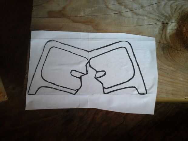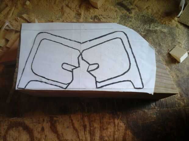 Necesita un pedazo de madera tres o cuatro pulgadas de espesor. Si le sucede que tiene una parte de una viga de 4 por 8 ahí como yo lo hice, estás de suerte. Si no, simplemente pegan algunos consejos para que tenga el espesor correcto. Ahora necesitas encontrar una plantilla para pegar a la placa. Puede dibujar uno, como yo lo hice o encontrar uno en Internet. Una vez tengas la plantilla lista, pegar a la madera. Usé un palillo del pegamento porque sale fácilmente sin dejar mucho residuo. Ya que mi mesa era tan grande, corté lo más pequeño por lo que era más fácil trabajar con.